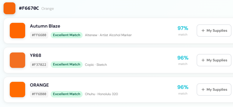The tool uses Delta E 2000 color science to compare your input colors against a database of over 3,600 individual art supplies, including the full ranges for all three brands in this guide plus Holbein, Derwent, Caran d'Ache, Winsor & Newton, Daniel Smith, Altenew, Tim Holtz, Sennelier, and more.